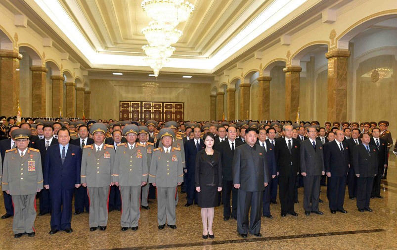 中國(guó)臺(tái)灣網(wǎng)12月18日消息 據(jù)臺(tái)灣媒體報(bào)道,17日,在平壤體育館舉行中央追悼大會(huì),紀(jì)念前最高領(lǐng)導(dǎo)人金正日逝世兩周年。當(dāng)天,金正恩和夫人李雪主(上圖前排左三)及朝鮮黨政軍領(lǐng)導(dǎo)人到安放金日成、金正日遺體的錦繡山太陽(yáng)宮拜謁。朝鮮中央通訊社發(fā)布照片后,有媒體隨即發(fā)現(xiàn),神隱62天的李雪主,消瘦了許多。(中國(guó)臺(tái)灣網(wǎng) 高旭)