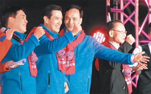 新北圣誕演唱會上,馬英九(左二)、郝龍斌(左一)、朱立倫(左三)三人同臺,氣氛活躍。(圖片來自臺媒)