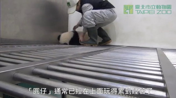 保育員把累得睡著的圓仔救下緩沖籠。(圖/臺北市立動物園)