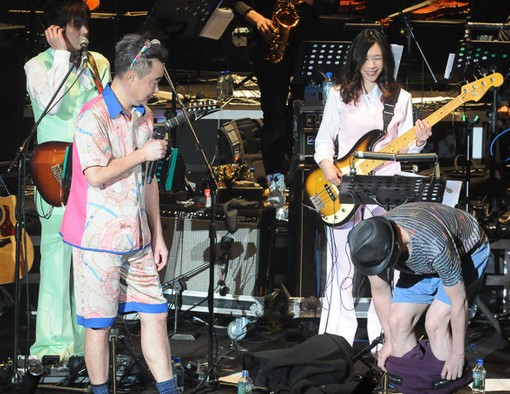 伍佰更是人拿出封鎖線,把“主人”陳升請下臺,一連獨自演唱3首歌曲,直到《愛你一萬年》才“放”陳升上臺合唱,兩人更激情演出“男男吻”,引起臺下瘋狂尖叫。