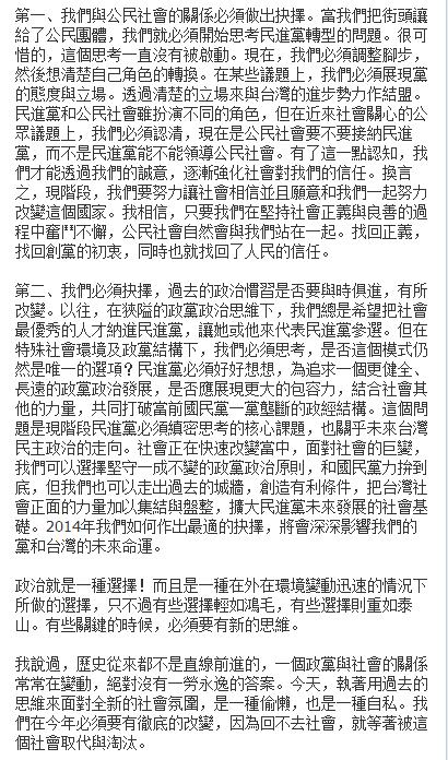 她還說,2013年的多次公民團(tuán)體走上街頭,民進(jìn)黨與公民社會的關(guān)系必須做出抉擇,“當(dāng)我們把街頭讓給了公民團(tuán)體,我們就必須開始思考民進(jìn)黨轉(zhuǎn)型的問題”。
