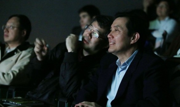 馬英九在導(dǎo)演齊柏林的陪同下,在“文化部”試片室欣賞《看見(jiàn)臺(tái)灣》。(臺(tái)媒圖)