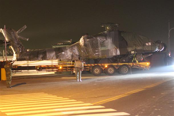 拖板車載運的直升機緊緊包著,不過仍可以目視得到機型,暗夜凌晨近4時駛出港區(qū),仍受到注目,路上的司機好奇,就停在路口觀看,也有零星的軍事迷拍照。警方出動數(shù)十名警力還有警車保護并維持交通秩序。