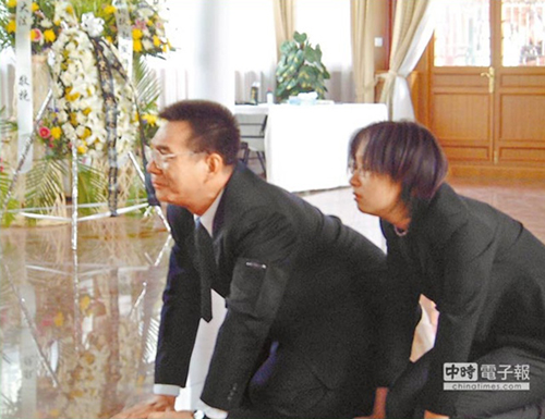 圖為林毅夫2002年在北京大學(xué)中國經(jīng)濟研究中心設(shè)置靈堂,通過網(wǎng)絡(luò)直播與宜蘭老家同步參加父親的告別式。告別式開始,林毅夫與女兒跪地哀傷地看著屏幕。(圖片來源:中時電子報)