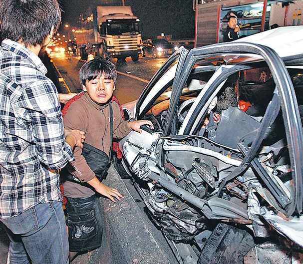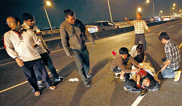 屏東駛往高雄的88快速道路昨日凌晨發(fā)生車禍,一名年長(zhǎng)婦女被拋摔在大橋上,她的外孫(箭頭處)不知所措,路人見狀上前幫忙。來自臺(tái)媒