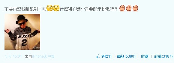 小豬則是在微博上貼出一張無奈的照片并說,“不要再幫我亂配對(duì)了啦!什么豬心戀,是要配米粉嗎?”