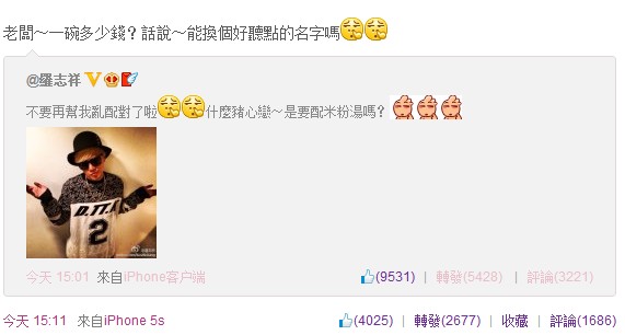 林心如也轉(zhuǎn)貼小豬的貼文,并回應(yīng)說,“老板,一碗多少錢?”“話說~能換個(gè)好聽點(diǎn)的名字嗎?”,搞笑看待緋聞。(中國(guó)臺(tái)灣網(wǎng) 何建峰)