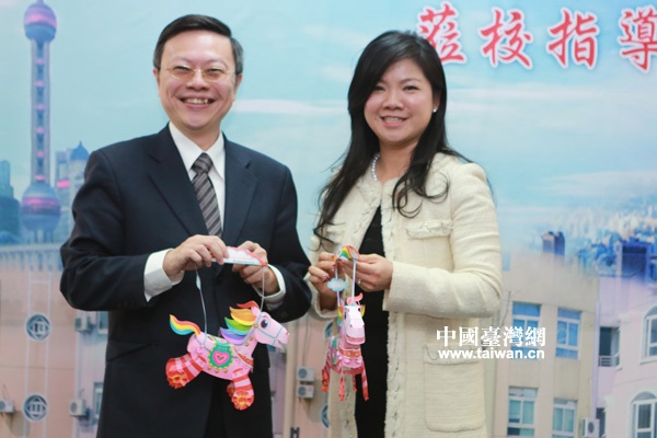 上海臺商子女學校董事長楊奕蘭向王郁琦贈送學生制作的小馬燈。(中國臺灣網(wǎng) 田云鵬)