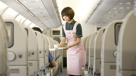 進(jìn)入艙門,飛機(jī)內(nèi)有100多個(gè)Hello Kitty的圖案,分別印于頭枕罩、紙巾、餐具、小吃和肥皂等。當(dāng)你用衛(wèi)生紙時(shí),上面印有Hello Kitty。拆開堅(jiān)果袋之前,也會(huì)看到 Kitty。機(jī)上乘務(wù)人員身穿Hello Kitty圍裙,銷售Kitty品牌限量免稅商品。乘客上機(jī)之前,就已沉浸在Hello Kitty的世界中。(中國(guó)臺(tái)灣網(wǎng) 高旭)