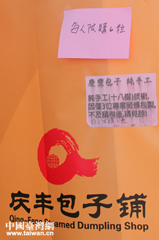 工作人員告訴記者,14日上午10點半左右,慶豐包子鋪前的臺灣民眾需要排隊等候,才能買到美味的包子。下午,記者趕到現(xiàn)場時發(fā)現(xiàn),包子鋪前貼出了限購?fù)ㄖ,“純手工(十八。┘妓,因僅3位專業(yè)師傅包制,不及請稍后,請見諒!每人限購6粒!