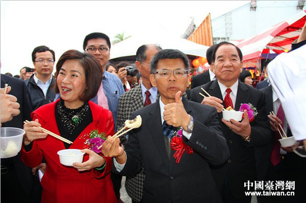 在開幕式上,臺灣行政部門“政務(wù)委員”楊秋興品嘗了習(xí)近平主席吃過的北京慶豐包子,并豎起拇指連連稱贊。(中國臺灣網(wǎng) 李婷婷 攝)