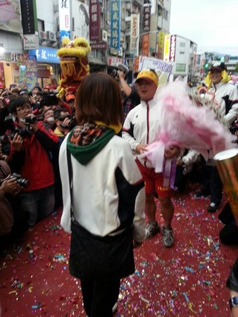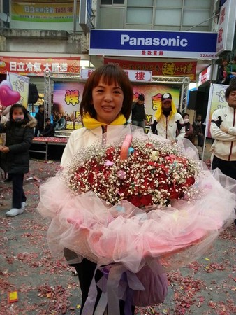 臺(tái)東元宵節(jié)炮炸邯鄲爺,今天出現(xiàn)不一樣的肉身邯鄲,手上的榕樹(shù)葉換成一束粉紅色玫瑰花,頭上綁著“為愛(ài)而戰(zhàn)”黃色布條,自信的挺身接受炮炸。