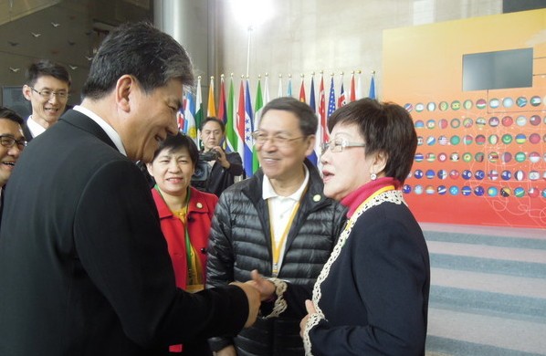 呂秀蓮提早到場(chǎng),與國(guó)民黨籍的“內(nèi)政部長(zhǎng)”李鴻源握手寒暄。(臺(tái)媒圖)