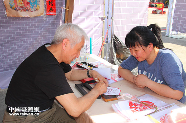 2月17日上午11時,距離撤展還有5個小時,京派剪紙圖樣已經(jīng)不多,圖為靳鶴年老師根據(jù)臺灣客人的要求,現(xiàn)場制作剪紙。(中國臺灣網(wǎng) 李婷婷 攝)