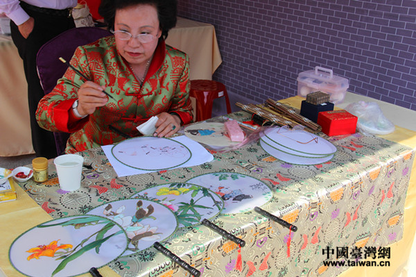 2月17日中午11點(diǎn),距離撤展還有5個(gè)小時(shí), 天橋神韻的扇子僅剩4把,圖為趙偉老師現(xiàn)場(chǎng)繪制扇面。(中國(guó)臺(tái)灣網(wǎng) 李婷婷 攝)
