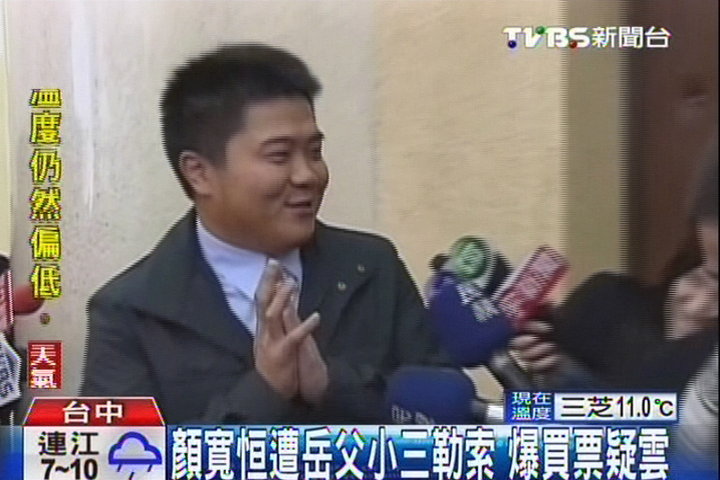 中國(guó)臺(tái)灣網(wǎng)2月19日消息 據(jù)臺(tái)灣TVBS報(bào)道,顏寬恒接棒父親顏清標(biāo),當(dāng)選臺(tái)中市“立委”,但沒(méi)想到卻出現(xiàn)一名自稱(chēng)跟顏寬恒岳父有婚外情的侯姓婦人,以公布他賄選證據(jù)為由,勒索2000萬(wàn)(新臺(tái)幣,下同)。