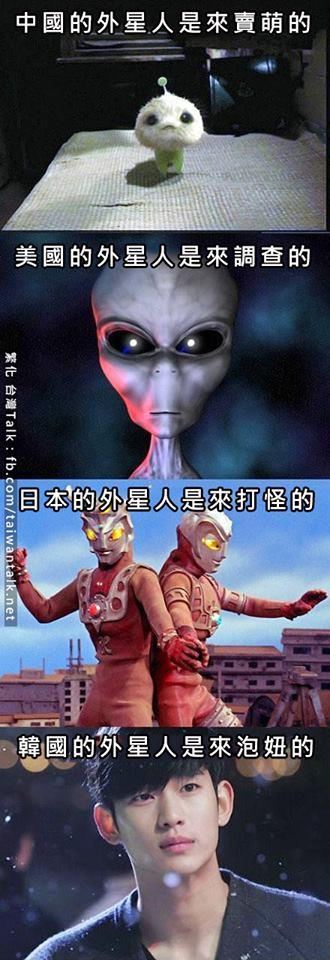 圖中有周星馳《長(zhǎng)江七號(hào)》中可愛的外星人七仔,它被說是到地球來賣萌;一般人印象中的大眼光頭“美國(guó)外星人”,被說是來調(diào)查地球的;至于來自日本的奧特曼,則被說是來打怪的;最后在《來自星星的你》中深情的“韓國(guó)外星人”都教授,更被網(wǎng)友說是想到地球泡妞。