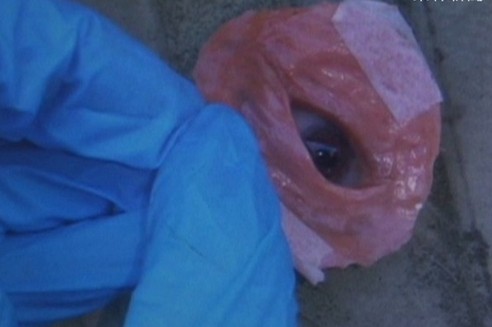 消防人員小心翼翼的爬上遮雨棚,這回不是要救受困的貓狗,而是要撿一顆掉在上面、一個像肉的“塊狀物”。消防隊員翻過來一看,竟然是一顆“眼睛”,而且做得相當(dāng)逼真,橡膠材質(zhì)摸起來跟皮膚一樣有彈性,還用透氣膠布黏起來。
