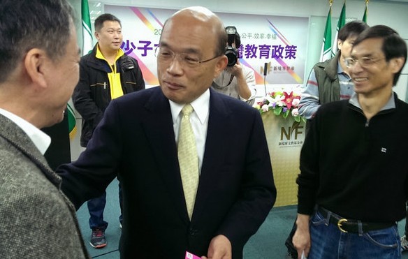 民進黨主席蘇貞昌26日出席“少子女化下的教育政策”發(fā)表記者會,和與會者寒暄。(臺媒圖)