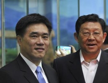 海協(xié)會會長陳德銘一行結(jié)束臺灣行,今日返京。圖為陳德銘會長(右一)與臺北市長郝龍斌(左一)合影。(網(wǎng)絡(luò)圖)