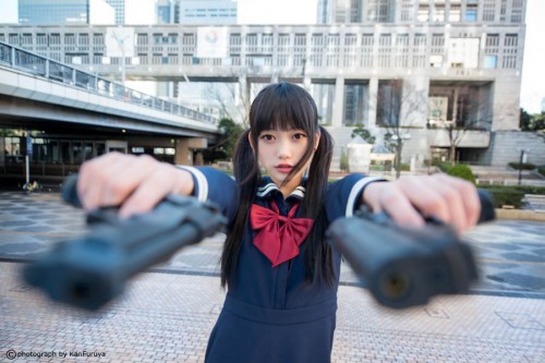 日本學(xué)生妹持槍萌照臺灣爆紅,海量美圖超越界。(臺媒圖)
