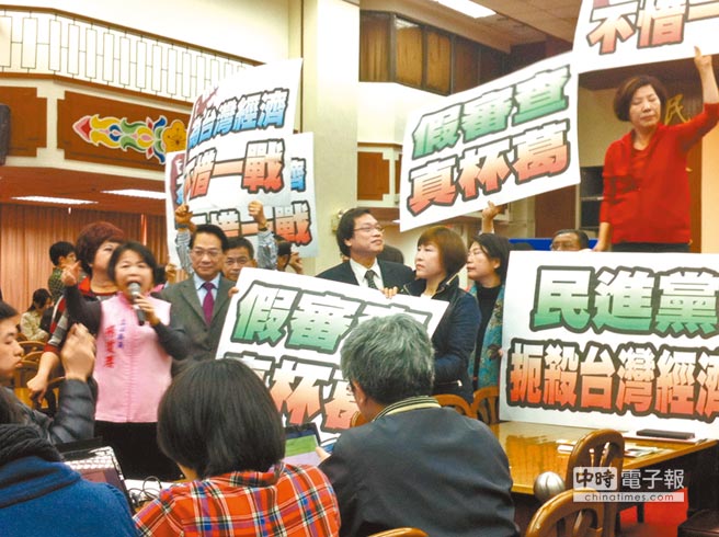 《服貿(mào)協(xié)議》初審第1天,藍綠陣營一早便因登記發(fā)言問題爆發(fā)口角,雙方在會場互相叫囂,藍營批綠營“假審查,真杯葛”。(圖片來源:臺灣中時電子報)