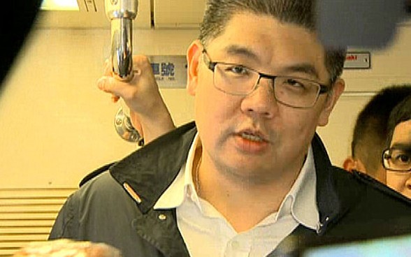 搭捷運談?wù)娍诌`法,連勝文幕僚急制止。(臺媒圖)