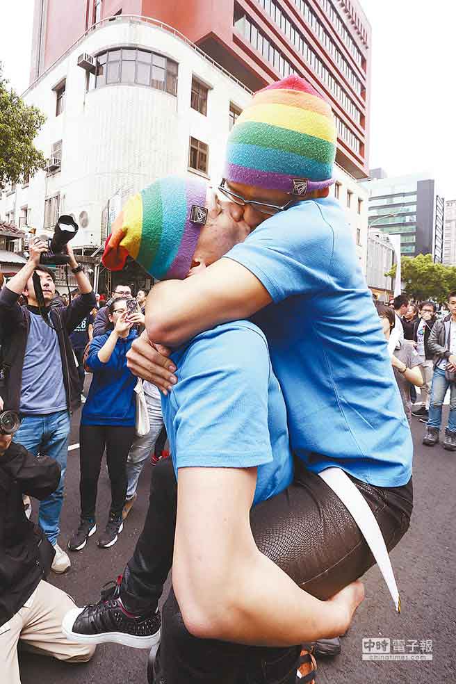 數(shù)百民眾16日中午不分“異同”于臺北濟(jì)南路“街吻”,力挺婚姻平權(quán)。(圖片來源:臺灣中時(shí)電子報(bào))