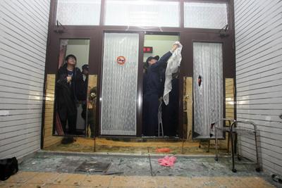 打破議場(chǎng)側(cè)門。抗議學(xué)生18日晚間突破“立法院”側(cè)門的警力,學(xué)生打破玻璃門沖入議場(chǎng)。圖為警方清理玻璃門碎片,避免刮傷人。(圖片來源:臺(tái)灣“中央社”)