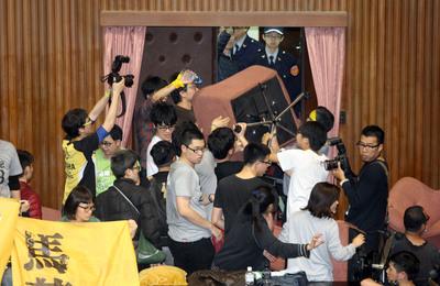 反服貿(mào)學(xué)生18日晚間突破“立法院”側(cè)門的警力,沖入“立法院”議場(chǎng)抗議,拿椅子堵住議場(chǎng)出入口,與警方對(duì)峙。(圖片來源:臺(tái)灣“中央社”)