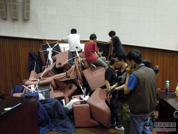 學(xué)生將議場(chǎng)內(nèi)椅子迭成一道墻,阻擋警方進(jìn)入。(圖片來(lái)自臺(tái)媒)