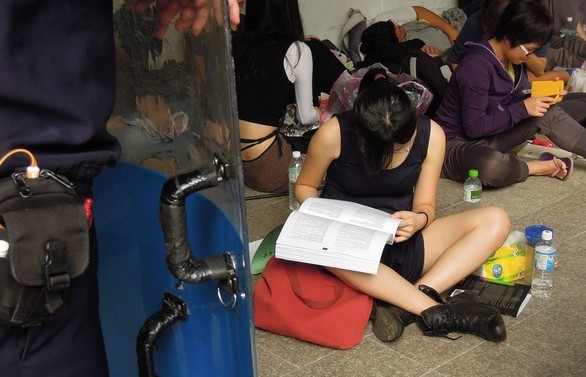反服貿(mào)女學(xué)生警盾前就地溫書。(臺(tái)媒圖)
