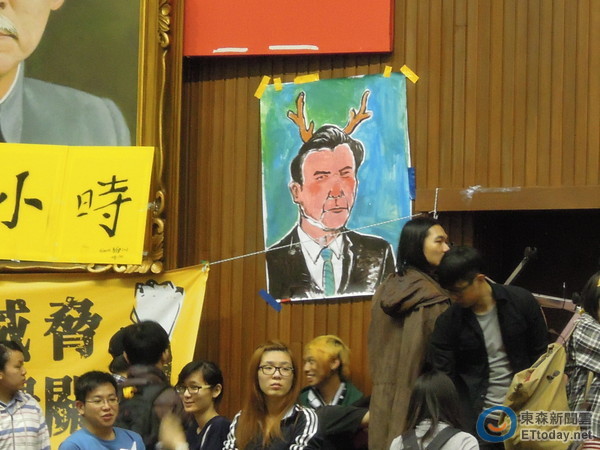 學生持續(xù)占領“立法院”議場,有學生畫“鹿茸像”諷馬英九。(圖片來自臺媒)