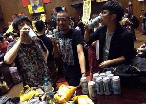 大批抗議群眾從18日深夜開(kāi)始攻占“立法院”,霸占主席臺(tái),不過(guò)網(wǎng)絡(luò)上接連傳出學(xué)生在現(xiàn)場(chǎng)喝酒作樂(lè)、滿桌零食,甚至玩親親自拍打卡照片,被不少網(wǎng)友批評(píng)“觀感不佳”。事后有眼尖網(wǎng)友發(fā)現(xiàn),原來(lái)光頭哥是罷黜者樂(lè)團(tuán)的郭姓主唱。