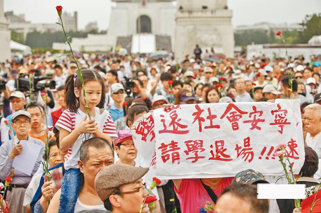 上千名的警眷家屬29日齊聚中正紀(jì)念堂,搖著手上的康乃馨,對于占領(lǐng)“立法院”的學(xué)生們發(fā)出溫情喊話,呼吁學(xué)生們趕快返家。(圖片來自臺媒)