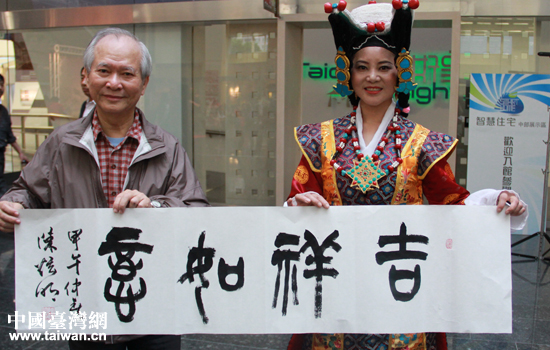 臺(tái)中市書法學(xué)會(huì)前理事長(zhǎng)陳玄明賜予來(lái)自西藏的表演藝術(shù)家墨寶“如意吉祥”。(中國(guó)臺(tái)灣網(wǎng) 高斯斯 攝)