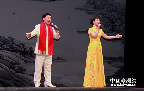 4月8日晚,由北京市文聯(lián)、北京市臺辦、北京市新聞辦主辦的第十四屆京味文化之旅首場演出在臺中市中興堂舉辦。圖為歌曲對唱《老北京叫賣聲》。(中國臺灣網(wǎng) 高斯斯 攝)
