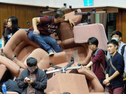 部分“立委”座椅在制作路障過程中損壞,但仍有部分完好,學(xué)生也將座椅陸續(xù)歸位。議場內(nèi)緊急醫(yī)療小組成員打包醫(yī)療用品,僅留2、3人因應(yīng)。