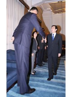 中國(guó)臺(tái)灣網(wǎng)4月11日消息 臺(tái)灣地區(qū)領(lǐng)導(dǎo)人馬英九今天接見(jiàn)國(guó)際特奧委會(huì)貴賓時(shí),與身高2.26米的國(guó)際特奧會(huì)形象大使姚明見(jiàn)面握手。馬英九特別抬起頭來(lái),姚明則稍微彎下腰,畫(huà)面生動(dòng)有趣。