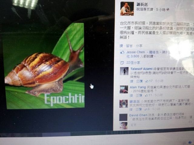 民進(jìn)黨臺北市長整合速度,謝長廷貼“蝸牛照”嘆無語(圖片為翻攝自謝長廷臉書,來自臺媒)
