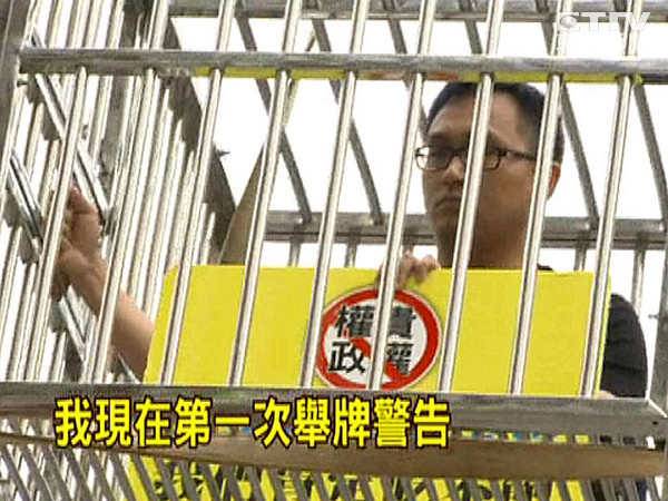 連勝文初選獲勝,反對者帝寶前“坐鐵籠”抗議。(臺媒圖)