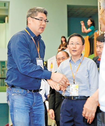 連勝文上臺時先與丁守中握手寒暄,簡短的交談后比鄰而坐。(圖片來自臺灣《中國時報》)