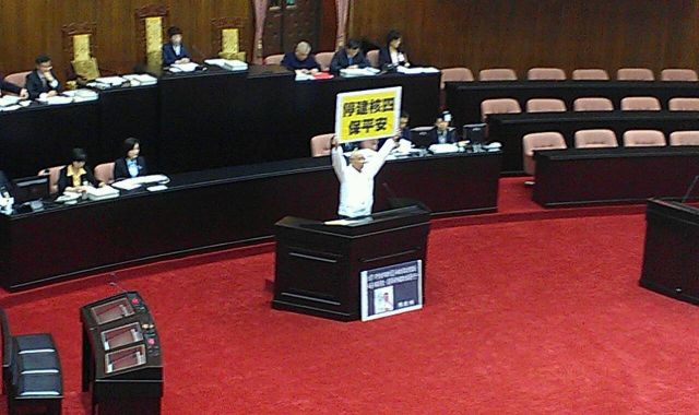 民進(jìn)黨“立委”陳歐珀在“立法院”高舉反核標(biāo)語(yǔ)但不發(fā)言,持續(xù)“無(wú)聲反核”。(臺(tái)媒圖)