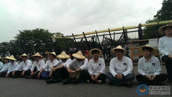 25日下午5點(diǎn),“立法院長”王金平宣布“院會(huì)”休息后,全體“綠委”在黨團(tuán)總召柯建銘帶領(lǐng)下前往凱道靜坐!傲⑽币ξ闹潜硎,黨團(tuán)成員將跨夜靜坐,表達(dá)深沉抗議;明、后天將與民間社團(tuán)協(xié)調(diào)、分進(jìn)合擊,向馬英九表達(dá)憤怒。由于馬英九辦公室前早已架設(shè)拒馬,“綠委”只能在拒馬前席地而坐,每個(gè)人皆頭戴斗笠、身著“民眾作主”白色T恤。(中國臺(tái)灣網(wǎng) 朱煉)