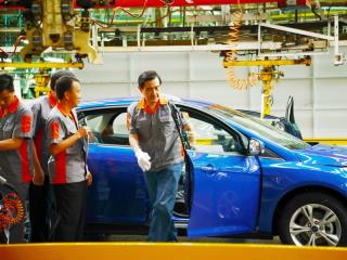 勞動節(jié)前夕,臺灣地區(qū)領(lǐng)導(dǎo)人馬英九前往中壢參訪福特六和汽車廠房,并與基層員工座談午餐。他還親自組裝車門,完成后還比贊。(圖片來源:臺灣“中央社”)