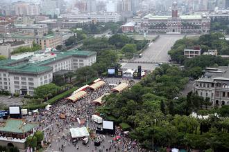 臺灣廢核行動平臺號召民眾在臺北市凱達(dá)格蘭大道靜坐,他們要求停建核四,并將游行到忠孝西路,再躺下占據(jù)馬路,圖民眾在凱道集合現(xiàn)場。(圖片來源:臺灣聯(lián)合新聞網(wǎng))