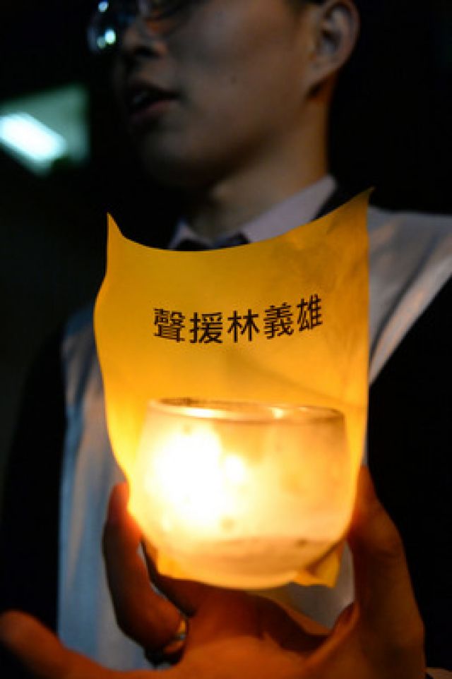 反核禁食的前民進(jìn)黨主席林義雄28日到臺(tái)大醫(yī)院就醫(yī),晚間顧立雄等律師群到臺(tái)大急診室門口,點(diǎn)燈為林義雄祈福。(臺(tái)媒圖)