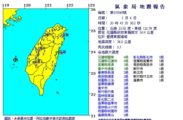中國臺(tái)灣網(wǎng)5月4日消息 據(jù)臺(tái)灣“東森新聞”報(bào)道,臺(tái)灣4日晚間8時(shí)43分左右,花蓮地區(qū)附近發(fā)生規(guī)模5.3級(jí)有感地震,最大震度達(dá)4級(jí)。從今天凌晨開始,花蓮地區(qū)即一直搖不停,晚間這起地震是有紀(jì)錄的第9起,之前的規(guī)模最大為3.9。
