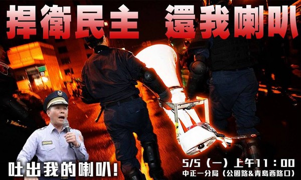 中國(guó)臺(tái)灣網(wǎng)5月5日消息 據(jù)臺(tái)灣媒體報(bào)道,反核民眾指控臺(tái)北警方拿走聲援用的2個(gè)喇叭和1個(gè)行動(dòng)式音箱,號(hào)召5日上午11時(shí)到中正一分局要分局長(zhǎng)方仰寧“還我喇叭”。臺(tái)大哲學(xué)系大五生洪崇晏也在facebook發(fā)文表示會(huì)到場(chǎng)力挺,呼吁網(wǎng)友一起到中正一局。