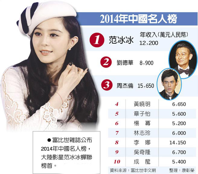 福布斯中國名人榜,范冰冰居首,劉德華第二周杰倫第三。(圖片來源:臺灣中時(shí)電子報(bào))